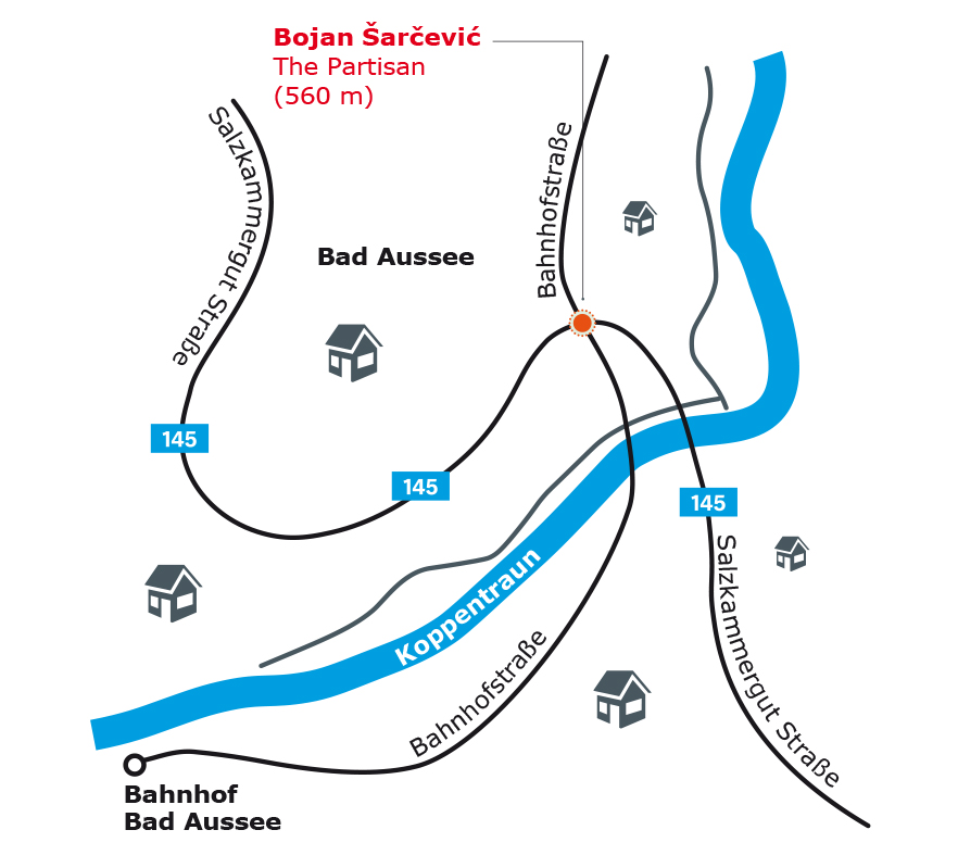 In 1938, as in many other places, the National Socialists received a warm welcome from most inhabitants of Bad Aussee. And here, too, people like Albrecht Gaiswinkler and Valentin Tarra secretly joined forces to build a regional opposition movement. Against this background the title of Bojan Šarčević’s work, The Partisan, makes reference to an issue that, if mentioned at all by the people in the region, remains controversial to this day. For decades, memory of the resistance movement has divided the local community in the Ausseerland. Supporters of the movement have rarely touched upon the topic while those who did not approve pretend it never existed. Meanwhile, attitudes have started to change slowly.